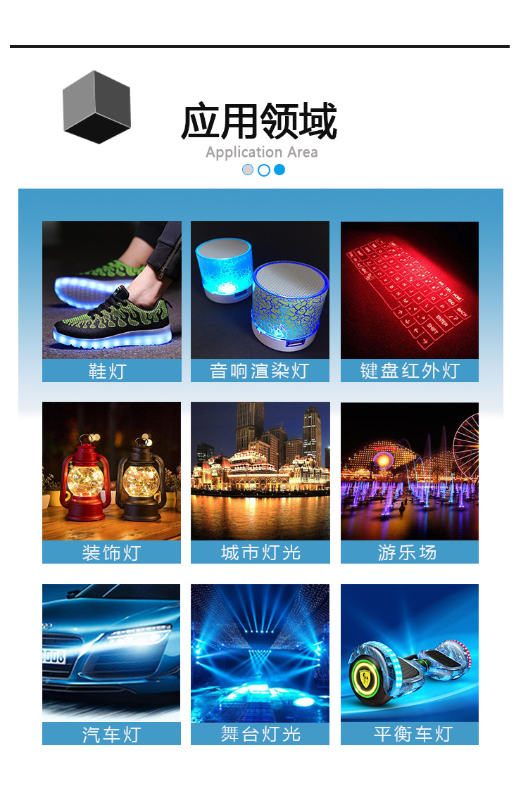 产品应用:高端数码应用、电子产品应用、家用电器应用、信号指示应用、仪器仪表应用、工业照明应用。