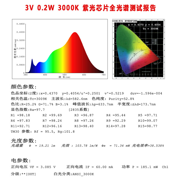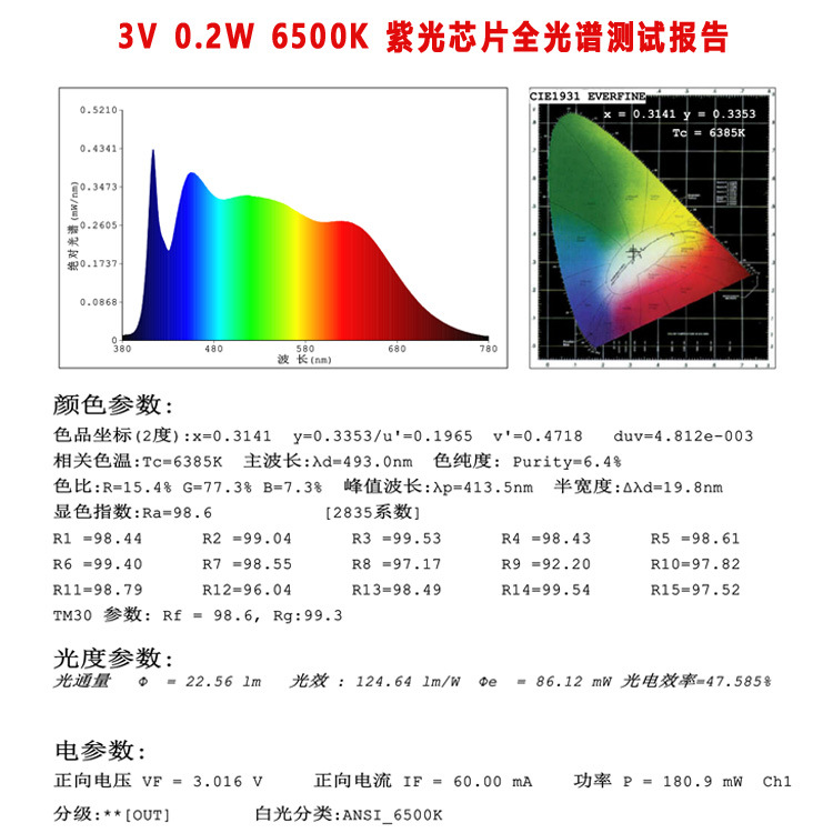 3V 0.2W 2835 全光谱 紫光方案 3V 0.2W 2835 RA〉97教育照明低蓝