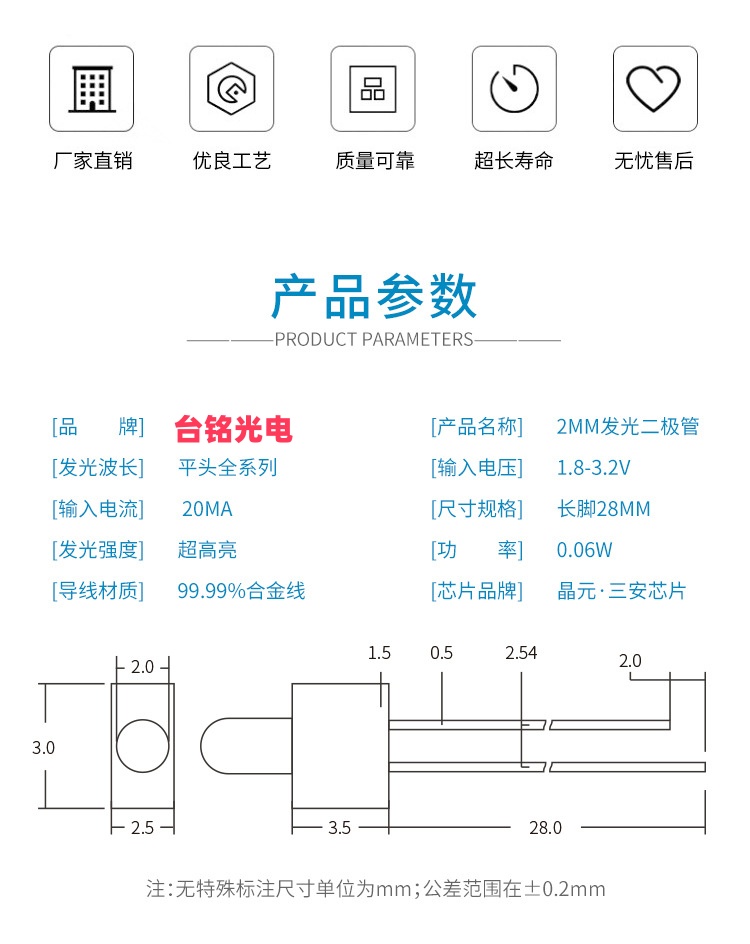• 尺寸:直径2mm(F2规格,部分厂家标注为φ2mm)