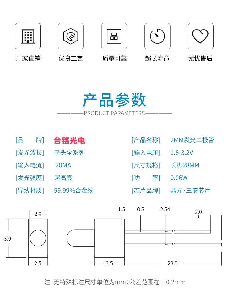 • 尺寸:直径2mm(F2规格,部分厂家标注为φ2mm)