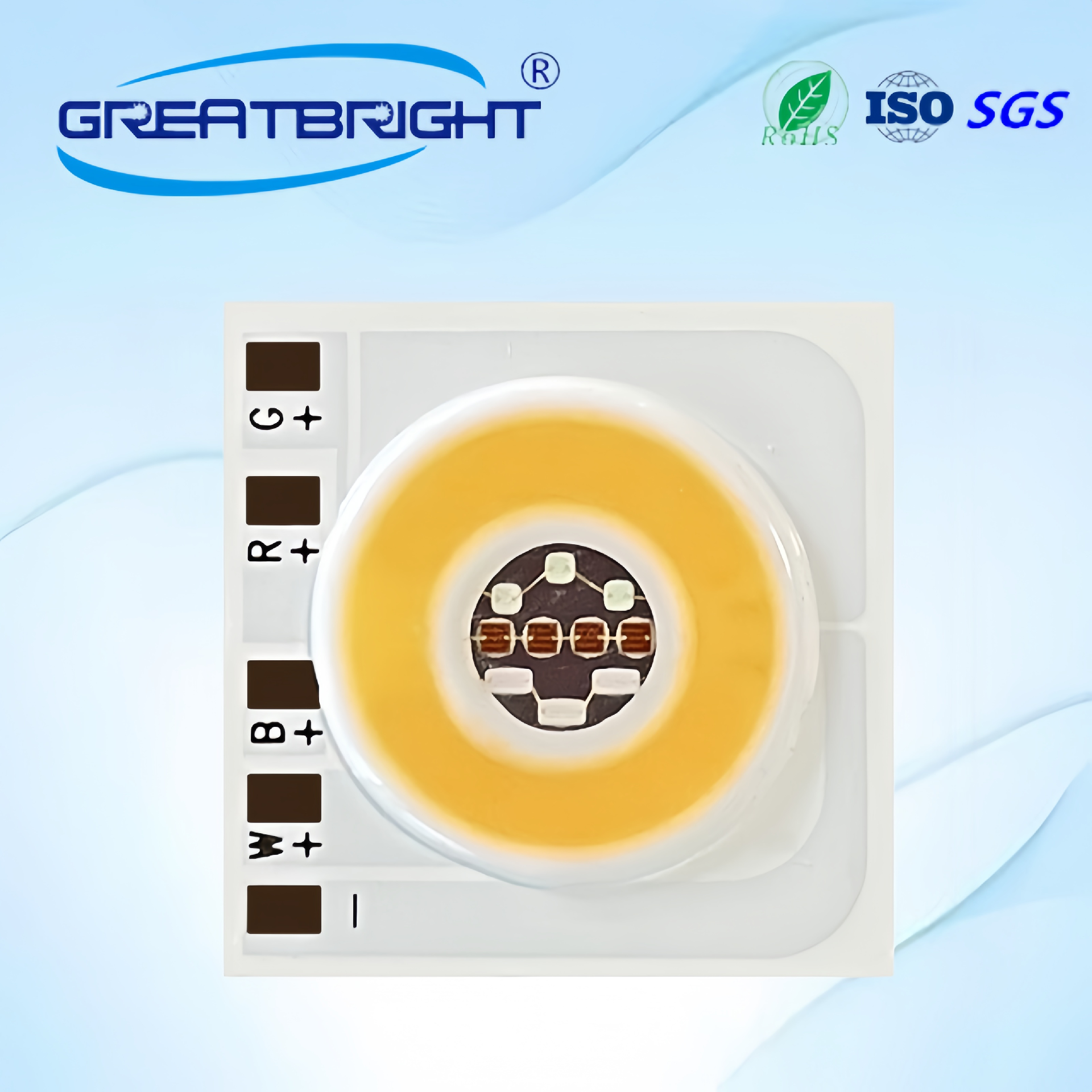 • 核心特点: 将四种颜色的LED芯片直接封装在一个基板上,实现高密度、高亮度的混光效果,并能发出纯净的白光。