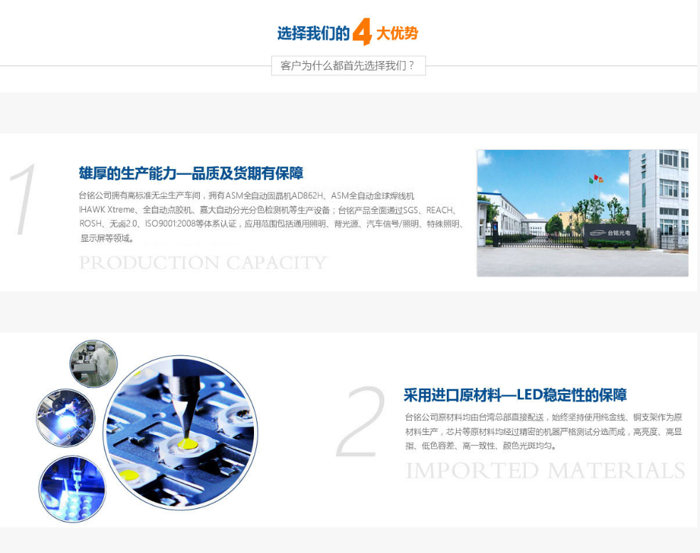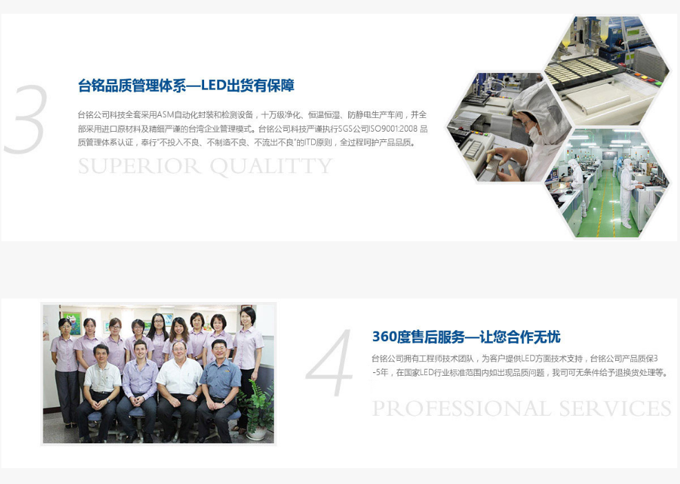 AG恒峰品质管理体系:AG恒峰光电科技全套采用ASM顶级自动化封装及检测设备,十万级净化、恒温恒湿、防静电生产车间,并全部采用进口原材料及精细严谨的台湾企业管理模式,AG恒峰光电严谨执行SGS公司ISO9001:2008品质管理体系认证,奉献“不投入不良、不制造不良、不流出不良”的ITD原则,全程呵护产品品质。