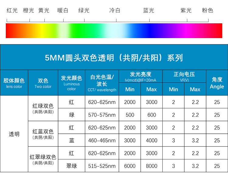 F5草帽双色LED灯珠(5mm直插)产品说明
